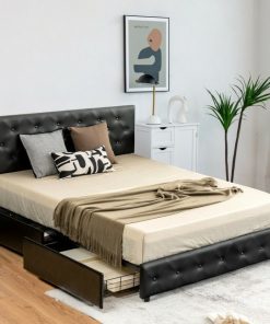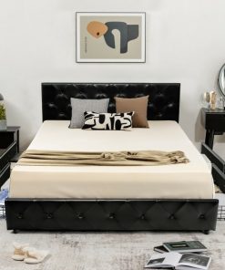Optimize your bedroom space with the Queen Size Black PU Leather Button Tufted Platform Bed with 4 Storage Drawers. Comes with 4 deep storage drawers under a button tufted bed frame. Solid wooden slats and powder-coated steel. Each support leg is equipped with different pads including non-slip foot pads and adjustable footpads. Without any complicated tools, the wooden slats and metal frame can be connected easily by a simple press and the bed frame also has a mute bar protecting the slats from frictions.