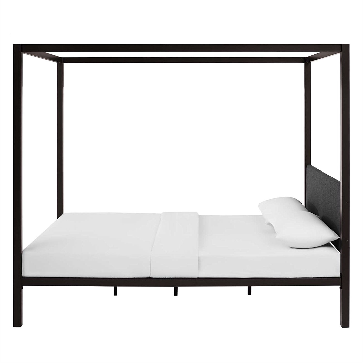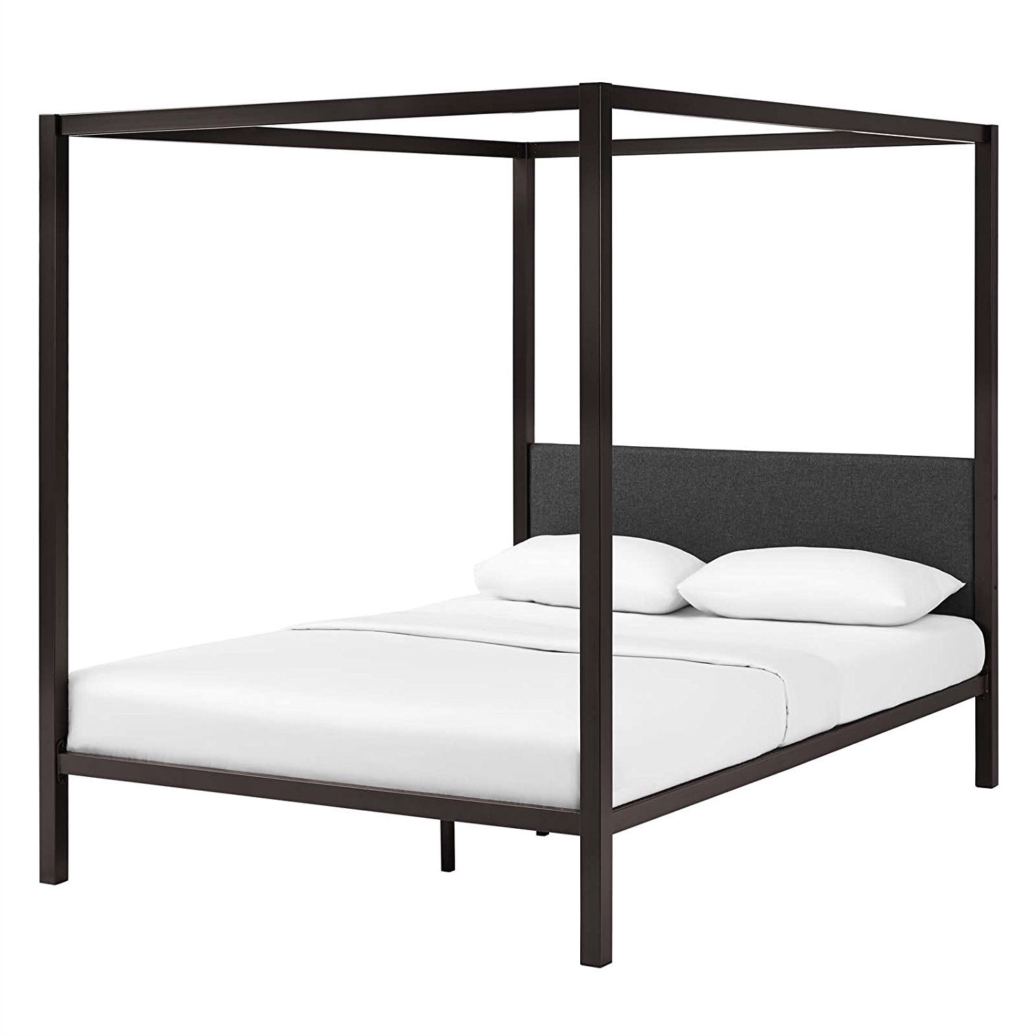Queen size Brown Metal Canopy Bed Frame with Grey Upholstered Headboard