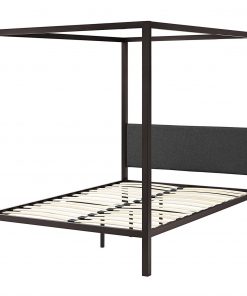 Withdraw from ruling chaos, and effortlessly command an illustrious mien with this Queen size Brown Metal Canopy Bed Frame with Grey Upholstered Headboard. Enhance the look by adorning with curtains to create a picturesque escape when refuge beckons. Solidly constructed with a steel frame and slatted wood support system, shine pastoral elegance with a canopy bed that supports up to 1323 lbs. It eliminates the need for a box spring and supports mattress types such as memory foam, spring, latex, and hybrid. Mattress not included.