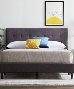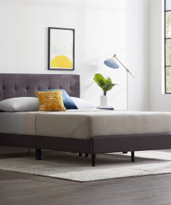 The Queen size Dark Gray Upholstered Tufted Platform Bed Frame features mid-century design, linen-like fabric, and sturdy support for a mattress. Durable and classy legs finish the design for a versatile look that will go well with most styles and preferences. The Queen size Dark Gray Upholstered Buttonless Tufted Platform Bed Frame eliminates the need for a box spring, and the easy assembly only requires a Phillips-Head screwdriver and the included Allen key. Fits any standard queen size mattress.