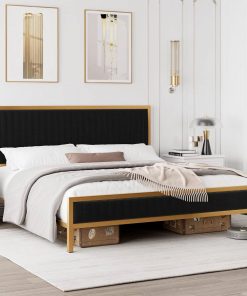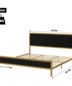 The headboard and footboard of this Queen size Gold Metal Platform Bed Frame with Black Velvet Upholstered Headboard are designed with minimalistic yet classic vertical channel tufting and filled with high-quality sponge for exceptional coziness. A premium golden lacquered metal frame, seamlessly combined with luxurious velvet fabric, gives your bedroom a regal ambiance. No matter if your style is modern or vintage, it is the perfect choice to decorate your room. The platform bed features a heavy-duty steel frame and 11 thickened solid wood slats firmly attached with metal screws that can support up to 1000 lbs, making it more comfortable and supportive for your mattress without a box spring, thus saving your money. Provide a reliable foundation for a good night’s sleep (recommended mattress: 8″14″). Extra-special silent strips are thoughtfully designed to reduce noise and strange squeaks between the slats and the bed frame. Plus, the soft padding under each metal leg effectively prevents your floor from being scratched and absorbs sound. This modern bed frame will bring you a quiet night. The bottom of the bed frame is 9.5 from the floor, so you can store some boxes, clothes, or shoes to keep your bedroom clean and tidy. The queen bed frame comes in a box that includes instructions and necessary tools, all pieces are labeled. Follow the clear instructions to assemble this beds within 20 minutes.