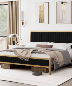 The headboard and footboard of this Queen size Gold Metal Platform Bed Frame with Black Velvet Upholstered Headboard are designed with minimalistic yet classic vertical channel tufting and filled with high-quality sponge for exceptional coziness. A premium golden lacquered metal frame, seamlessly combined with luxurious velvet fabric, gives your bedroom a regal ambiance. No matter if your style is modern or vintage, it is the perfect choice to decorate your room. The platform bed features a heavy-duty steel frame and 11 thickened solid wood slats firmly attached with metal screws that can support up to 1000 lbs, making it more comfortable and supportive for your mattress without a box spring, thus saving your money. Provide a reliable foundation for a good night’s sleep (recommended mattress: 8″14″). Extra-special silent strips are thoughtfully designed to reduce noise and strange squeaks between the slats and the bed frame. Plus, the soft padding under each metal leg effectively prevents your floor from being scratched and absorbs sound. This modern bed frame will bring you a quiet night. The bottom of the bed frame is 9.5 from the floor, so you can store some boxes, clothes, or shoes to keep your bedroom clean and tidy. The queen bed frame comes in a box that includes instructions and necessary tools, all pieces are labeled. Follow the clear instructions to assemble this beds within 20 minutes.
