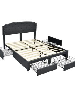 This Queen Size Grey Linen Adjustable Headboard 4 Drawer Storage Platform Bed comes with a steel frame and 2 kinds of foot pads (anti-slip and adjustable) and hold up to 660 lbs. The whole bed frame is covered with breathable linen fabric, offering a soft touch and feel. The high headboard is adjustable from 41″ or 44″depending on the mattress thickness you choose. At the bottom, 4 deep drawers fitted with casters offer roomy storage space for seasonal clothes, pillows, bed sheets and more. Thanks to a platform design, a mattress will be directly supported without a box spring.