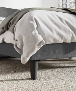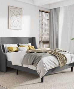 This Upholstered Linen Headboard Wingback Platform Bed features clean lines and a wingback design that grounds your bedroom with a modern look. The engineered wood frame is built on tapered legs with a sleek black finish, and it’s upholstered in a linen blend with the hue of your choice. Compatible with an adjustable base, this bed works best with a standard-height mattress. We recommend pairing it with a patterned quilt and a few throw pillows for a finished look. This bed has a handy slat system that eliminates the need for a box spring. Assembly is required. Suitable for all kinds of mattresses.