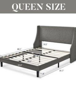 Queen Size Grey Linen Blend Upholstered Platform Bed with Wingback Headboard