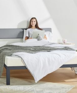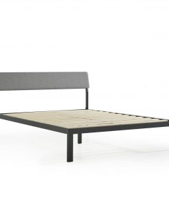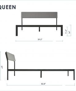 Queen Size Grey Soft Fabric Metal Headboard Platform Bed Wooden Slats is a simple and modern design made with a unique combination of metal and fabric. The traditional upholstered headboard is lowered in height and angled to create a backboard for the perfect leaning position. This backboard is filled with high density foam for comfort and support, available in soft grey. We’ve also left 11 inches of clearance under the bed for convenient storage. Enjoy quick and easy assembly with roll-out non-slip taped wooden slats and no other tools needed. Assembly required. Fits any standard Queen size mattress.