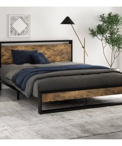 - Queen size Metal Wood Platform Bed Frame with Industrial Headboard