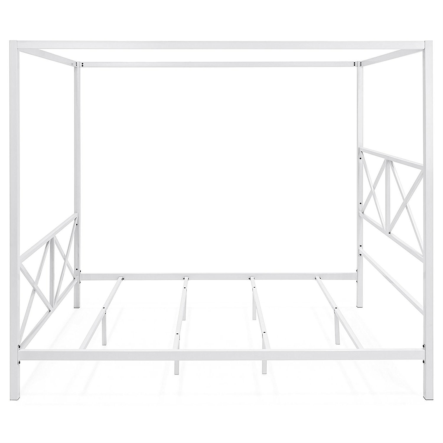Accentuate your bedroom with a metal bed frame sure to add to your nightly excitement for a restful slumber. This Queen size Modern Industrial Style White Metal Canopy Bed Frame has a 4-slat support system with legs to guarantee exceptional support. With sturdy top rails, you can drape curtains around the border and fall into a peaceful escape. This frame takes bedroom decor to a whole new level.