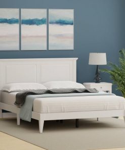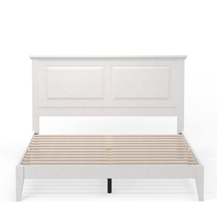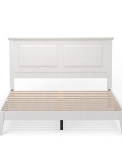 This Queen Size Retro Solid Oak Wooden Platform Bed in White with prominent headboard is a must have for any bedroom! Inset panels and retro molding that adds refined elegance to any bedroom or guest room. It is crafted from solid oak, a naturally hard and durable wood. Platform bed sits on straight and slightly tapered legs that raise this bed almost 8 inches off the floor. This system of slats eliminates the need for a box spring and works best with any standard mattress (recommended 10 inches of thickness). Assembly is required.