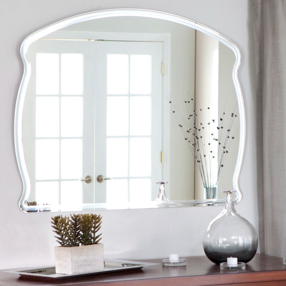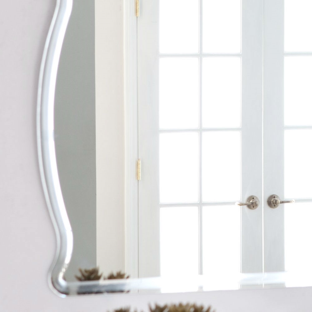 This Rectangular Arch Top Wavy Modern Frameless Wall Mirror is sure to brighten up any room of your home. This unique rectangular mirror has an arched top and wavy edges – it is perfect for dressing up any wall. Constructed of strong 3/16 glass, it features a beautiful polished border. Mounting hardware is included with the mirror.