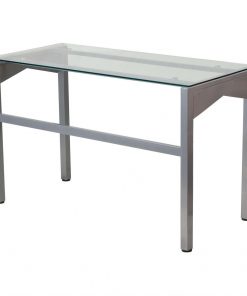 The versatile Rectangular Writing Table Office Desk with Clear Tempered Glass Surface is a sleek, attractive design thats great for casual computer usage, working from home, or managing the household bills. The tempered glass top is incredibly durable and crystal clear so papers and electronics appear to be floating on air. The supportive frame is made of metal in a silver powder-coated finish with braces for added stability. Some assembly is required.