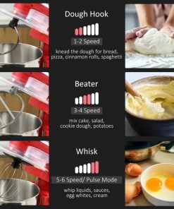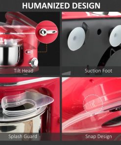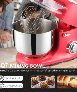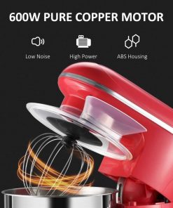 This Red Stainless Steel Tilt 600W Electric Mixer 6QT is designed with a high-performance 600W pure copper motor and multiple speed choice to more effectively knead dough and beat eggs, this food mixer provides versatility for frosting, creamy dressings, dough, and baked goods. This standing mixer has a 6-level speed ranging from low to high, providing options to knead gently and thoroughly mix,. Press the ‘P’ button to mix at the fastest speed in a short time. This stand mixer’s 6qt mixing bowl lets you make two dozen cookies or four loaves of bread in a single batch. It also includes a dough hook, beater, and whisk to expand your culinary options. The tilt-head design allows less mess when changing out accessories. The suction cups under the bottom provide excellent stability. NOTE: Don’t forget to put the bowl cover on top before turning it on.