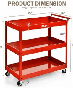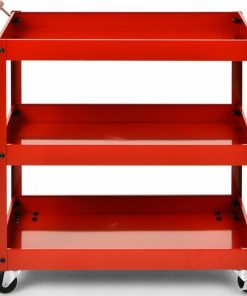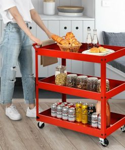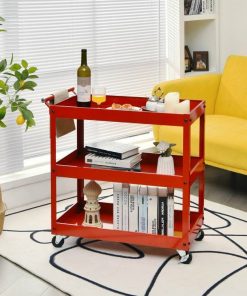 This Red Steel Frame Kitchen Serving Utility Cart on Wheels with 2 Bottom Shelves features spacious storage space, which can hold all kinds of items at one time and sort them neatly. The upper layer can place some commonly used items for easy access, while the lower layers can hold different tools to improve work efficiency. Adopting sturdy steel construction, this heavy-duty service cart has a high load-bearing capacity, and each tier can hold up to 55 lbs. Durable shelves will not rust or dent easily, so they can be a great addition to your work area. Equipped with 4 flexible rotating casters (2 lockable), you can move the utility cart to any place without effort. And the brake system makes it convenient for you to stop the cart as needed. Besides, there is a humanized handle for convenient control when moving it around. This multi-functional service cart is suitable for various occasions, such as home, office, restaurant, workshop, garage, warehouses and more. In addition, the service cart with compact size is perfect for small apartments with limited space, and you can use it to store books, tools, etc. Comes with detailed instructions and complete accessories, you can complete the installation in a short time. Moreover, the smooth surface is easy to clean with a wet cloth, which helps to save time and energy.