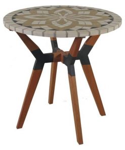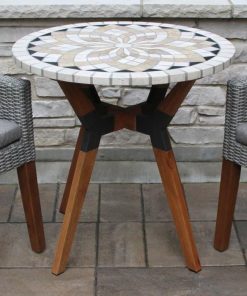 Wrangle in the farm hands with this Farmhouse 30-inch Round Bistro Style Marble Outdoor Patio Table. White and beige marble plus dark natural stones create a modern barn home outside experience. The eucalyptus wood leg base with gray metal connectors add a sturdy profile. Eucalyptus is prized for its natural resistance to insects and decay. This eucalyptus is 100% plantation grown, rainforest alliance certified, and features a brown umber stain that lasts for several years.