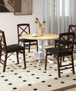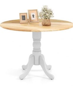 Crafted with natural rubber wood, the Round 40-inch Solid Wood Kitchen Dining Table with White Legs and Natural Top is solid, not easy to crack and deformation-resistant for prolonged lifespan. Moreover, been through exquisite workmanship, it is smooth and burr-free. The natural wood finish and elegant curved trestle legs make this dining table a stunning addition to your home. Hence, the dining table can easily blend with various decor themes to improve the style of your living room, kitchen, and dining room. The rustic dining table comes with stable splayed legs, which ensures excellent stability. Additionally, each leg is equipped with adjustable feet pads, thus the dining room table will not wobble on uneven grounds. This dining table can accommodate up to 4 people, making it the perfect choice for small family gatherings. In addition, the thoughtful round corners are designed to avoid scratching or bumping. Equipped with detailed instruction and numbered parts, the assembly of the dining table will not trouble you. With a healthy paint finish, the dining table can be easily cleaned with a wet cloth.