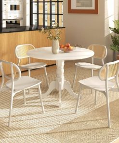 Crafted with natural rubber wood, the Round Solid Wood Kitchen Dining Table in White Farmhouse Wooden Finish is solid, not easy to crack and deformation-resistant for prolonged lifespan. Moreover, been through exquisite workmanship, it is smooth and burr-free. The white wood finish and elegant curved trestle legs make this dining table a stunning addition to your home. Hence, the dining table can easily blend with various decor themes to improve the style of your living room, kitchen, and dining room. The rustic dining table comes with stable splayed legs, which ensures excellent stability. Additionally, each leg is equipped with adjustable feet pads, thus the dining room table will not wobble on uneven grounds. This dining table can accommodate up to 4 people, making it the perfect choice for small family gatherings. In addition, the thoughtful round corners are designed to avoid scratching or bumping. Equipped with detailed instruction and numbered parts, the assembly of the dining table will not trouble you. With a healthy paint finish, the dining table can be easily cleaned with a wet cloth.