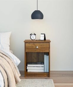 Keep your bedroom essentials and cell phone within arm’s reach on a convenient Nightstand with Drawer. Available in several traditional neutral finishes, this Rusic Brown Oak Farmhouse 1-Drawer Bedroom Nighstand with Open Shelf is the perfect addition to your bedroom. The Nightstand is constructed of laminated particleboard for a cost effective build that is both trendy and functional. The Nightstand has a bottom cubby that can be used to store books or magazines while the drawer offers concealed storage. Use the top surface for a reading lamp or use it to display a few accessories for added style. The Nightstand ships flat to your door and requires assembly upon opening. Two adults are recommended to assemble. Once assembled, the Nightstand measures to be 24.13” H x 17.72” W x 15.67” D.