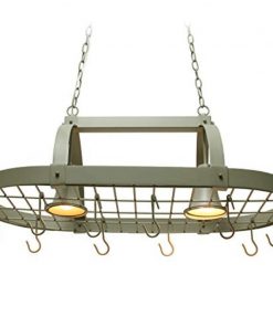 Your pots and kitchen utensils will be easily accessible with this stylish Rustic 2 Light Brushed Nickel 10 Hook Ceiling Mounted Hanging Pot Rack. Doubling as pot storage and task lighting. Comes finished in a clean brushed nickel, this traditionally-designed piece will add an industrial look to your cooking space. This fixture requires two 60-Watt Type A standard medium base incandescent bulbs that are not included.