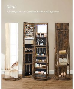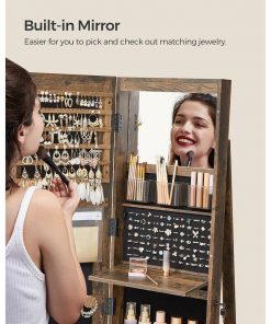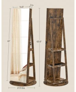 This Rustic Brown Wood Jewelry Cabinet Armoire Organizer Freestanding Rotating Mirror comes with a 14.6″ x 61″ frameless, full-length mirror thats easy on the eyes and gives you a head-to-toe reflection, making your daily outfit checks more enjoyable. 120 earring slots, 54 stud earring holes, 18 necklace hooks,104 ring slots, 3 bracelet rodsthe jewelry jungle ends here. Plus, there are 3 compartments, 2 drawers, 4 shelves, and a bag for your makeup! 6 LED lights illuminate your jewelry when you open the door of this jewelry organizer, allowing you to pick out the right accessories easily without waking your beloved one with ceiling lights. A built-in mirror and a flip-over shelf as a counter for your makeup create a mini vanity table, allowing you to apply makeup and accessorize your look without closing the cabinet door. The large 21.5″ Dia. round base and quality MDF of this jewelry armoire ensure stability while its velvet lining protects your jewelry from scratchesyour bling will remain intact for years to come. This jewelry mirror cabinet rotates 360 degrees to allow you to access what you need easily from the 3 shelves on the back, and hide them out of sight when not in use. Who doesn’t want flexibility like that? This jewelry armoire with a mirror comes nearly completely pre-assembledall that’s left is to attach the base and then add the shelves on the back of the cabinet. Following the clear instructions step by step, you’ll have this mirror cabinet ready in a jiffy. If you want to keep your valuables safe and out of reach, this mirror jewelry cabinet ticks your boxes. 2 keys allow you to lock your cherished bling away, so no little hands get in.