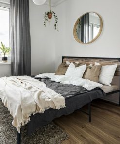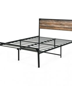 This Rustic FarmHome Metal Wood Platform Bed Frame in Queen Size combines a simple rustic industrial Farm House style. Comes with a sturdy black metal bed frame and vintage wooden headboard. Constructed of powder-coated steel slats, the metal bed frame ensures rugged and durable structure. 5 reinforced support legs and solid screws enhance its overall stability and provide better support for the bed frame. Bed has 13.5 inches under-bed storage space to store boxes, suitcase and other items.