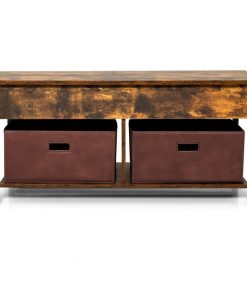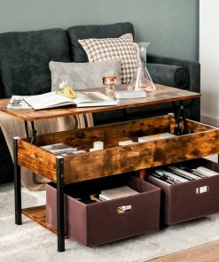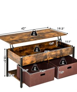 This Rustic FarmHouse Lift-Top Multi Purpose Coffee Table with 2 Storage Drawers Bins can be lifted to 23.5 inches providing a floating surface that is much closer to you for convenience. The metal lifting system gives reliable support while the anti-collision pads fitted underneath prevent slams. In addition to the lifting tabletop, the center table also offers 3 storage compartments open or enclosed to classified storage. Comes with 2 folding fabric drawers that can be removed to be used as storage bins separately. Features a sturdy construction that consists of premium MDF and heavy-duty steel and has adjustable foot pads.