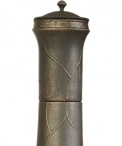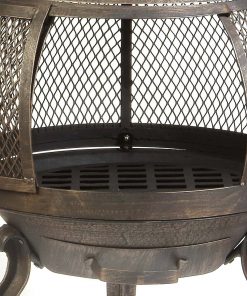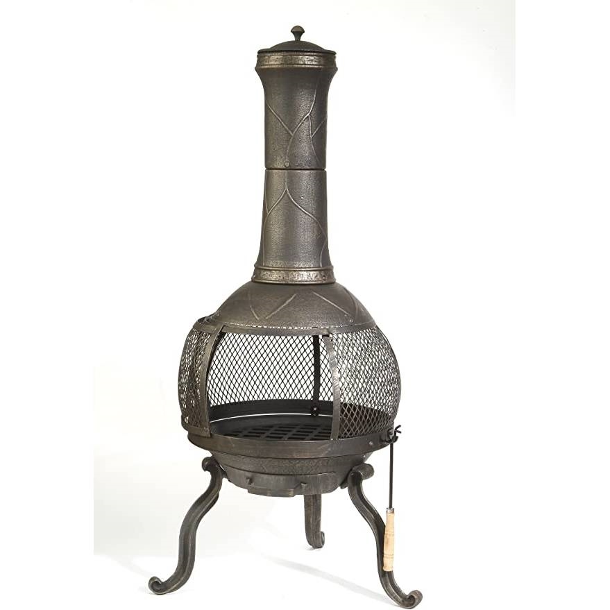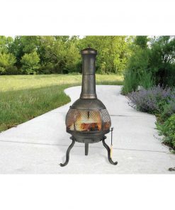 Add warm color and a fantastic heating element to your patio with this Rustic Outdoor Steel Cast Iron Chimenea Wood Fire Pit. Situating this unit within your yard creates an amazing gathering spot for friends and family. Has a 20.5 inch diameter, center chamber accommodates fire logs, and a sliding door makes it simple to access this area. The included, steel grate keeps the logs elevated for air circulation and an even burn, and its large grid allows debris to drop into the integrated ash catcher, providing both safety and convenience. Three, 9.5 inch tall legs form a stable support, perfect for placement on a level, fireproof surface, while a generous, 24 inch tall chimney creates even more height and visual interest. Curved, raised lines on this vent celebrate the rounded piece, and a top cap prevents rain from reaching the flames. A band of wire mesh helps keep the fire contained, and the steel and cast iron construction forms a lasting item.