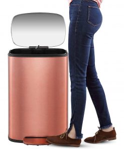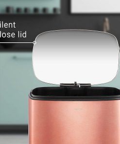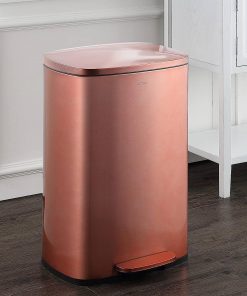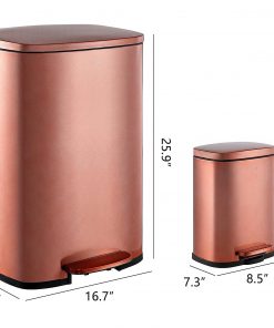 This Set of 2- Copper Gold finish stainless steel rectangular trash can set is the perfect solution for the family or office in need of top-of-the-line functionality trash cans. Featuring an easy step-on peddle open lid, finished in fingerprint-resistant brushed stainless steel, and has a removable plastic liner that makes bag changes a cinch. Includes both a 13-gallon trash can and smaller 1.3 gallon step-on pedal trash bin both in beautiful copper rose gold finish.