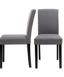 This Set of 2 – Grey Fabric Dining Chairs with Black Wood Legs would be a great addition to your home. Sold as a set of 2 dining room chairs – not full sized, but they are well made, clean corners, nice fabric can match with almost any decor theme. Overall dimension: 21″ L X 17″ W X 35″ H, dimension details are showed in the display picture. Make sure dimension meets your requirements before purchase.