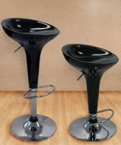 This Set of 2 Ice Cream Scoop Style Barstools in Black will add high style to your home, office, or restaurant/bar. Painted to a glossy finish and features a bright chrome base and footstool with matching colored collar above the base. Each chair swivels and adjusts to bar and counter height. Gas operated pump is tested to 100,000 operations. Adjustable seat height of 22″-30″.