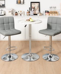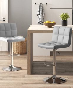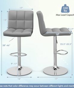 These Set of 2 Modern Adjustable Height Barstools w/ Comfortable Grey PU Leather Seat combine modern and classic styles that are perfect for your restaurant, bistro, coffee shop, patio, home kitchen, or any other decorative theme. Both the base and the footrest are made of durable metal, which makes the bar stool have a strong load-bearing capacity and are easy to clean. Fluid lines and square design will immediately enhance the decoration of your home bar-restaurant. The side pneumatic handle can adjust the height of the bar stool from 25″ to 33″ making it suitable for people of different heights. The 360-degree swivel design can help you move your body around. The high resilience sponge cushion seat can give you a comfortable sitting experience. In addition, a semi-circular footrest that is durable and stable provides a resting place for your feet and legs. Bar stools with a rubber ring increase friction with the ground, which not only protects the floor but also prevents slipping.