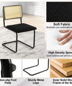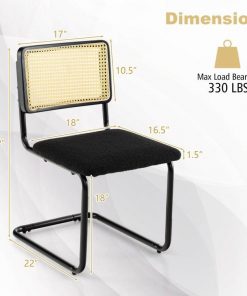 This Set of 2 – Modern Mid-Century Black Dining Chair with Beige Rattan Backrest features unique and chic appearance, making it a stunning addition in various occasions with different decor theme. Besides, the cantilever design adds to its beauty while giving you the feeling of floating. The backrest of the armless cane mesh back chairs come with a rattan mesh backrest, which is breathable to increase comfort. Additionally, the backrest features a slight spring when someone sits in to help you find the comfortable sitting position. Filled with a high density sponge, the soft seat of the 2 set dining chair will bring you surprisingly comfort and help you dispel fatigue. What’s more, the solid wood seating board will provide stable support. Supported by U-shaped metal legs, the dining chair set of 2 is stable enough to hold up to 330 lbs separately. And spray treatment makes it not easy to rust to support long-term use. Moreover, non-slip protectors are equipped to protect the floor from being scratched. With complete accessories and detailed instructions, the rattan dining chair set of 2 can be quickly put together within 5 minutes. The overall dimension is 22″ x 18″ x 32″ (L x W x H), and the seat size is 18″ x 16.5″(L x W).