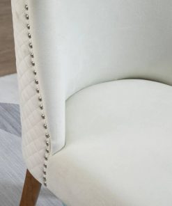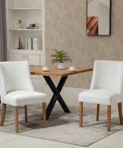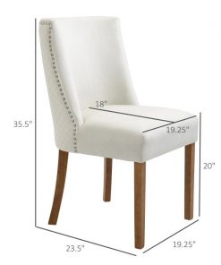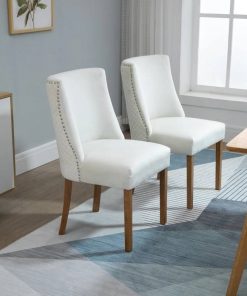 Create a stylish and cozy dining area with this White Modern High Back Nail Head Trim Upholstered Dining Chairs, Set of 2! Includes 2 chairs that can be used for having dinner, a conversation for two or accent chairs in your home. Chairs include a high backrest and wood legs for a modern and contemporary design that complements your home décor. Use in the kitchen, dining room, bedroom, office, and more. Sit back and sink into these upholstered accent chairs! The chairs covered with velvet-touch polyester fabric offer good breathability. Includes a high back and a sponge padding seat for added comfort and support while you lounge. The dining room chairs are suitable for daily use. All four legs are made with solid wood construction for a stable seating area.
