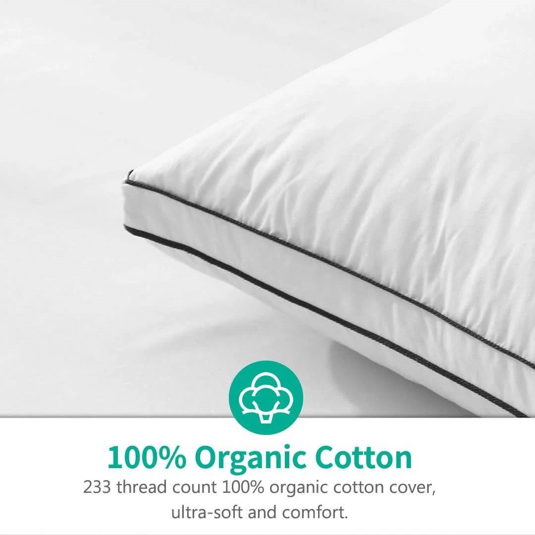 This Set of 2 Queen size Gusseted Goose Down Feather Pillow in Organic Cotton Fabric is made of 100% down-proof cotton fabric and premium down duck feather, classic down feather gusseted bed Pillow Insert is a breathable, durable, and skin-friendly down alternative pillow. Perfect for anyone who wants to own a pillow for 10 years or more. Filling with the softest and smallest feathers by medium density, Our down feather pillow insert is extra soft while still providing suitable support for optimum neck and shoulder comfort, so even sensitive sleepers can enjoy a cozy sleep. Perfect for most types of sleepers such as back or stomach sleepers. Quilted with 1 gusseted and decorative black piped edges, this elegant pillow can match your bed in any style. Compliant to RDS, Downpass, and OEKO-Tex Standard 100. Were committed to making products better for you, high cleanness, odorless, cruelty-free, and sustainable. It is a good choice for family and friends, Hurray! Upon receipt, you can clap gently your pillow to recover its full shape. Recommended to regularly air them in the sun for 1~2 hours for healthier use. Recommended to use with pillowcase/sham/pillow cover. Machine washable and dryable. The pillow insert with the 233-thread-count organic cotton fabric will keep you feeling fresh all night long. Premium feathers & down filled with responsibly sourced feathers & down, soft and breathable, if you like to hug into your pillow these are for you! Soft and puffy, these gently supportive pillows feel pleasingly malleable.