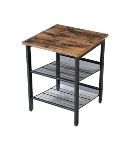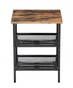 The industrial look of the black iron frame is complemented by the rustic top of the side tables, creating an exciting mix of styles. This Set of 2 Side Table Nightstand with Medium Wood Finish Top and Mesh Shelves fits in the living room next to your sofa or functions as a functional pair of bedside tables. Each end table has two sturdy mesh shelves, both of which you can attach either flat or slightly slanted to properly position magazines, books or a variety of other items on them.