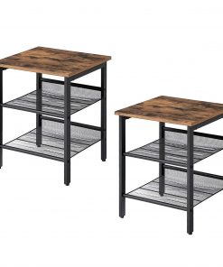 The industrial look of the black iron frame is complemented by the rustic top of the side tables, creating an exciting mix of styles. This Set of 2 Side Table Nightstand with Medium Wood Finish Top and Mesh Shelves fits in the living room next to your sofa or functions as a functional pair of bedside tables. Each end table has two sturdy mesh shelves, both of which you can attach either flat or slightly slanted to properly position magazines, books or a variety of other items on them.