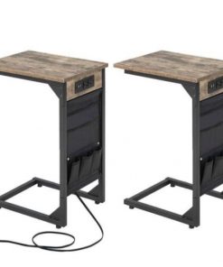 Be ready for life with these handy Farmhouse Charging Station C Shaped End Tables – Set of 2! No more yielding to fixed household power outlets, the side table has a 6.6 ft power cord to gain a large placement Each charging station contains 2 outlets (110-125V 12A) and 2 USB ports (5V 2A). Expect for the 16″ x 12″ (L x W) tabletop, the end table also features a 15″ x 9.5″ (L x W) side bag that consists of 2 long bags and 3 small bags. The c-shaped end table boasts a strong and rustproof metal frame, which contains triangle metal for higher strength