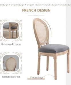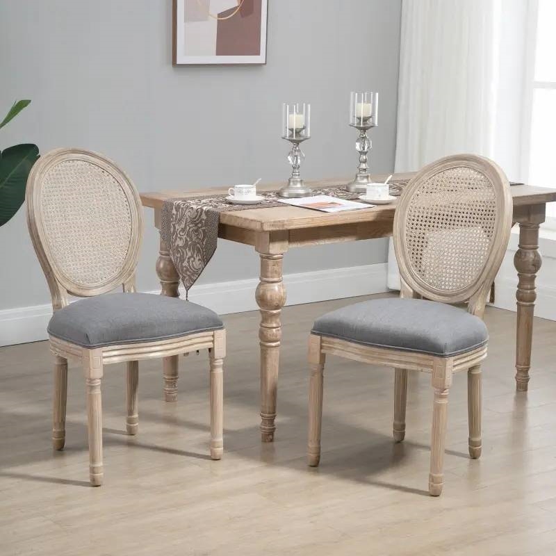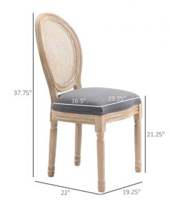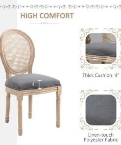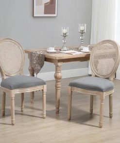 These Chic French Style Set of 2 Vintage Upholstered Armless Rattan Back Dining Chairs Grey Wash has an elegant and rustic style, gracefully curved back, classic color scheme, and beautifully carved leg patterns. These armless chairs have a rubberwood frame and legs, and linen fabric upholstery with a high-density sponge makes these modern dining chairs breathable and provides high comfort. The padded backrest supports your back and lumbar, while the armless design allows for multiple sitting options and freedom of movement while seated. These dining set chairs work great in your dining room, kitchen, or living room. The footpads on each leg ensure you won’t scuff up your hardwood or tile floors and stay in place on the carpet.