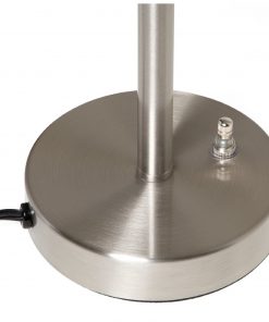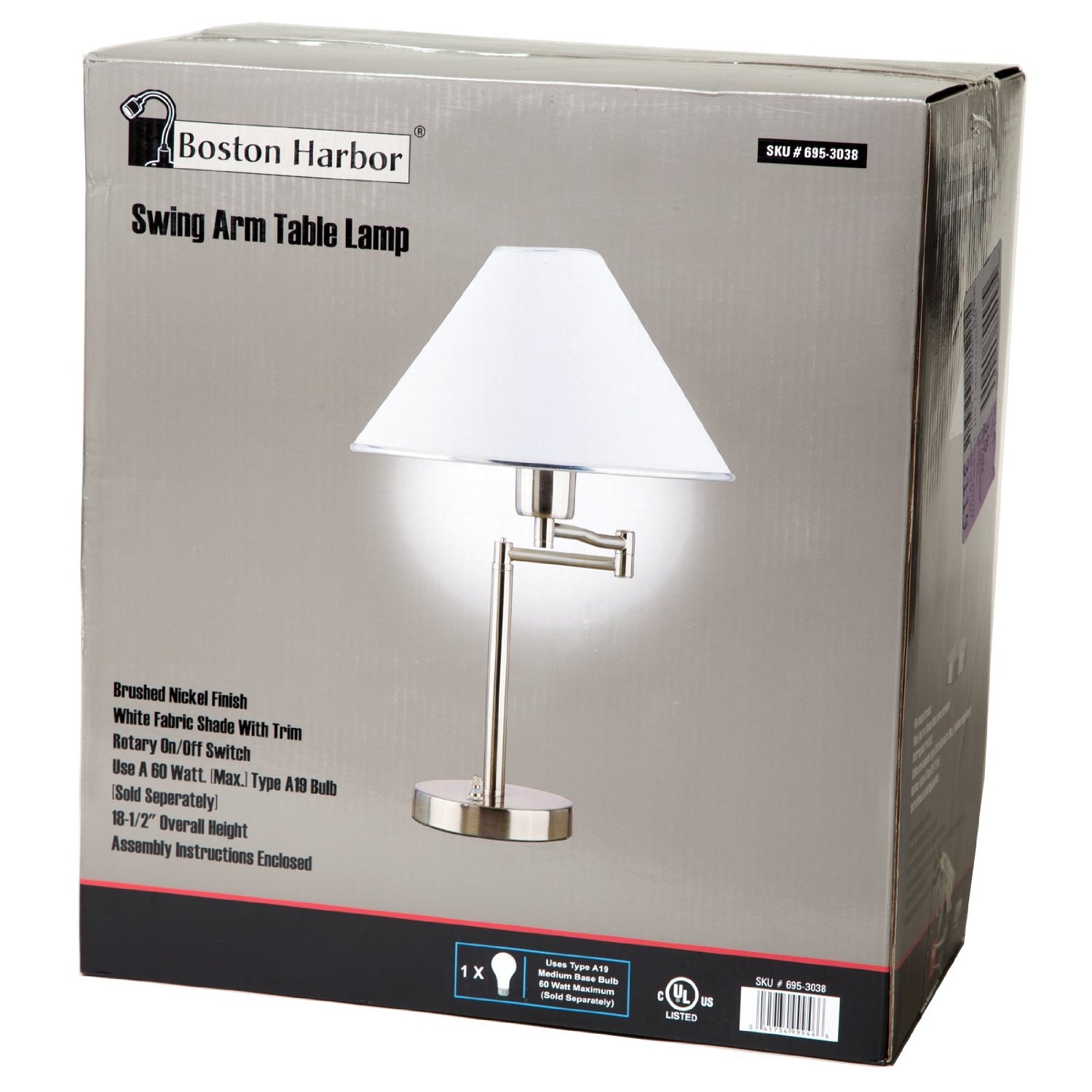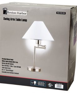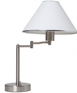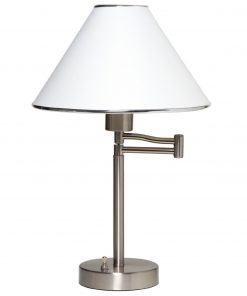 This Sing Arm Table Lamp in Brushed Nickel and White Fabric Shade is a great way to provide light at your desk. Lamp is finished in satin nickel and has a white fabric shade with trim. With the swinging arm, the lamp can provide light wherever you need it and can be adjusted to an overall height of 18-1/2″. Uses a 60 watt maximum A-19 bulb (sold separately).