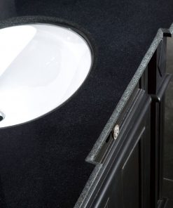 This Single Sink Bathroom Vanity with Cabinet & Black Granite Countertop / Backsplash is a simple way to breathe new life into your bathroom décor. Its stunning cabinet base is made from sturdy, solid wood, featuring a two-door storage area built into the design. The piece is finished in an antique black and features solid metal hardware with a nickel finish. A black granite countertop is included, pre-drilled for a 4-inch minispread faucet assembly and paired with a white ceramic oval undermount sink basin; faucet assembly is not included. A complementary backsplash is included.