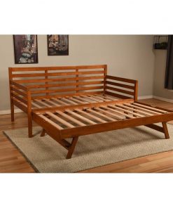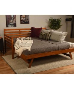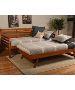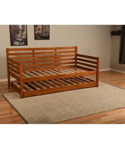 The Solid Wood Day Bed Frame with Pull-out Pop Up Trundle Bed in Medium Brown boasts clean lines and attractive angles. It’s available in 3 different finishes that will blend in with any color scheme in your home. The Pop up can be stored under the bed and is easily wheeled out when needed. The Pop up converts this daybed to King-size or can be used as an additional twin bed. Whether you’re using it everyday, or just on occasion, this daybed will hold up to your lifestyle.