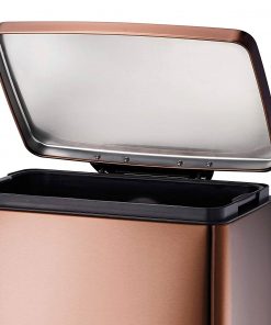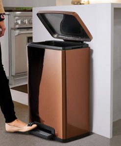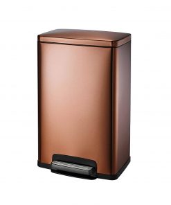 This Stainless Steel 13-Gallon Kitchen Trash Can with Step Lid in Copper Bronze is stylish and functional solution to organize rooms in any home or commercial space. Unique features include a sturdy and sleek stainless steel satin-finish body with a print and stain-free coating, a dense polypropylene lift-out liner with vented base for easy bag removal, an easy step-open pedal with a soft-closing lid.