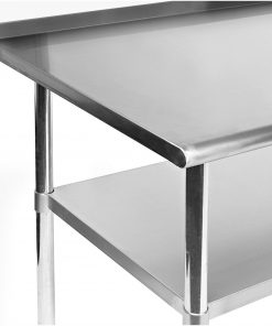 This Stainless Steel 72 x 24 inch NSF Certified Kitchen Prep Work Table with Backsplash is constructed from 18-gauge #430 stainless steel, and is the perfect work surface for use in a kitchen, bar, restaurant, laundry, school, hospital, or any other commercial setting. It is NSF certified to meet strict standards for public health protection and built for high-volume use to last a lifetime. This table features an extra heavy-duty top with a 1-1/4″ tall backsplash, an adjustable-height galvanized under-shelf, and galvanized legs with adjustable non-marring feet that eliminate table wobble on uneven floors. The edges on the front and back of the tabletop are rounded for working comfort. Fast and easy assembly.