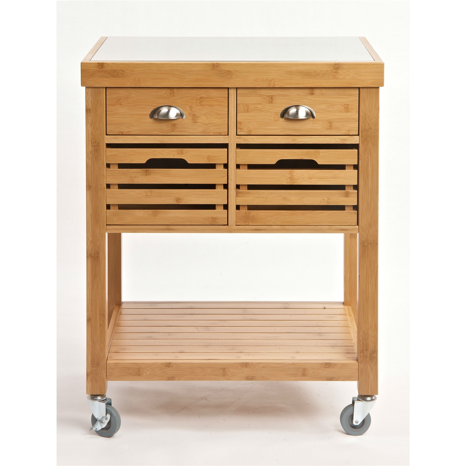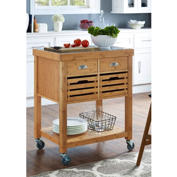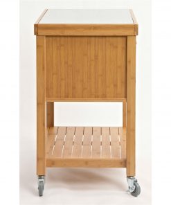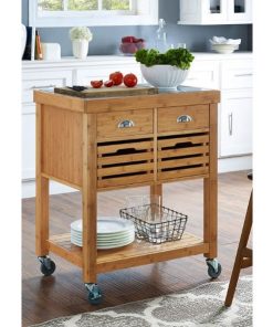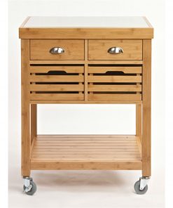 Add storage space and modern style to your kitchen with this Stainless Steel Top Bamboo Wood Kitchen Cart with Casters. Beautifully designed, this kitchen cart is crafted from solid bamboo with a stainless steel inset and a natural bamboo finish, which complements a variety of decors. Two pull-out drawers and two pull-out baskets provide ample storage space for utensils, kitchen gadgets, tea towels, and more, while the bottom shelf is perfect for larger kitchen items or a decorative piece. The castors on the bottom make it easy to maneuver this cart so you can keep it off to the side when not in use or wheel it into your kitchen when you need added counter space. This kitchen cart is CARB P2 compliant, and you’ll love the simple elegance it brings to your home.