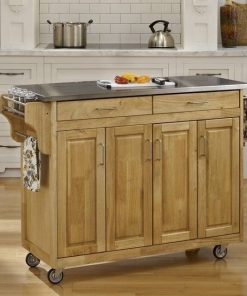 Construction consists of sustainable hardwood with a clear coat finish Stainless steel top Four cabinets, two drawers, and three adjustable shelves At one end there is a spice/condiment rack with a towel bar while the other end features a paper towel holder Dimensions: 48-3/4-inch width by 17-3/4-inch depth by 35-inch height Height: 94 pounds