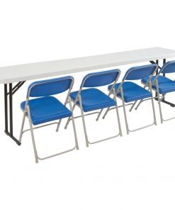 • 72″ long rectangular plastic folding table with steel frame for temporary placement and compact storage when not in use