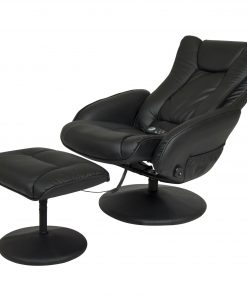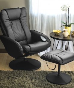 Relax with the Sturdy Black Faux Leather Electric Massage Recliner Chair w/ Ottoman. Comes equipped with 5 pre-programmed massages, 9 intensity levels, and 2 modes to knead the upper and lower back, thighs, and calves. A double-padded backrest with soft cushions on the armrests, seat, and ottoman provides optimal lounging comfort. A wireless massage controller lets you conveniently switch massage settings without moving and store it away in the built-in side pouch after use. Crafted of easy-to-clean faux leather and a sturdy metal frame, this massage recliner and ottoman set is built to last for years to come.