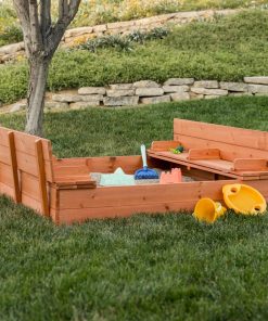 Come sit, shovel, and play! Sturdy Brown Cedar Kids Complete Seated Sandbox is a great way to entertain kids at home. Transform any backyard or outside play area into a space where children can socialize, entertain, and explore. Heat-treated cedar wood allow the sandbox to remain sturdy and durable for a long-lasting playtime solution. Built with a screen to help keep sand inside of the play area while allowing moisture to drain into the ground. Designed with a split cover that unfolds and turns into 2 benches for up to 4 children or 2 adults