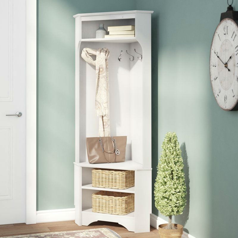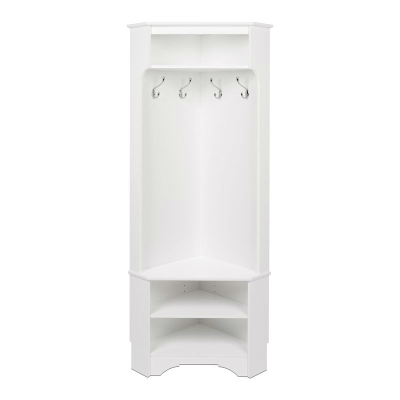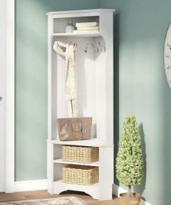 Keep your foyer organized and functional with this charming Tall Sturdy Entryway Corner Hall Tree in White. Crafted in Canada from composite wood with laminate veneers, this unit strikes a tall rectangular silhouette with simple moldings, a distinctively carved kick plate, and a deep wedge back thats designed to fit snugly in the corner. Two lower shelves provide a perfect place for storing pairs of your go-to shoes, while an upper shelf is a great place to put your out-the-door essentials. A built-in bench offers you a seat to take off your shoes, while four double-pronged metal coat hooks await all your hats, coats, jackets, and totes.