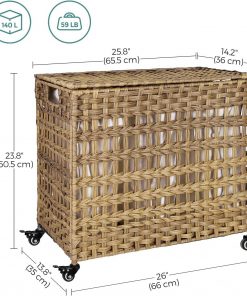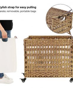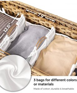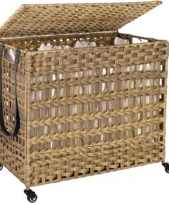 Has the overflow of laundry found its way into the middle of the room? Its time to offer them a home with this Tan PP Rattan 3-Basket Laundry Hamper Sorter Cart with Removable Cotton Bags, which is handwoven in rattan style and will surely spice up your space. With this laundry sorter, you can sort your laundry by color or material before washing; there are 3 laundry bags available so you can keep your red socks from accidentally turning your clean, white shirt into pink. 3 bags are separate, removable, and with handlesnow you dont have to take everything out when you only want to wash the darks; just grab the bag of dark clothes and shake it all out into the washer. With 4 wheels and a stylish synthetic leather strap, even your kid can help roll or pull a weeks worth of laundry to the washer; 2 brakes allow you to lock it in place. A durable Laundry Basket with Wheels supported by a metal frame, 3 separate inner bags, foldable design, and easy assembly that can be done in minutes. It’s easy to toss your dirty clothes onto the chair or floor. But before you feel unhappy in a messy room and spend more time gathering them up, why not try this laundry basket with 3 compartments? The chaos is hidden under the lid, and even better, you can finish the sorting while tossing.