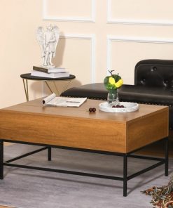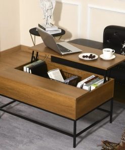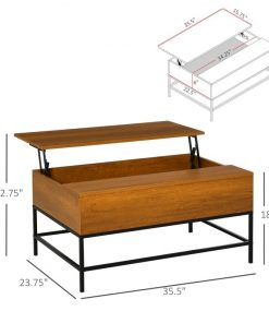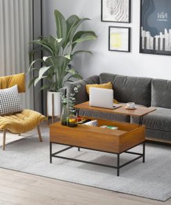This Traditional Farmhouse Brown Lift Top Coffee Table w/ Hidden Storage Black Metal Legs can be lifted up and forward, creating a perfect surface for working or dining. A high-quality gas lift device allows the coffee table to be raised and lowered safely and quietly. Under the tabletop of this modern coffee table is a large compartment designed to store different items such as magazines, laptops, remote controls, and game controllers. Made of high-quality P2 grade MDF board and industrial-style metal legs.